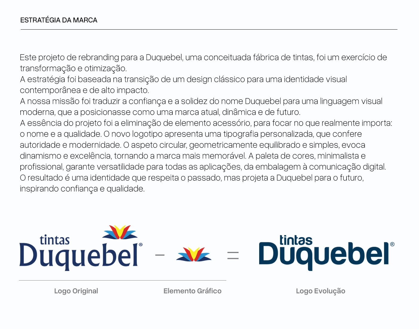 Tintas e VernizesA estratégia da Duquebel com este rebrand assenta na modernização da sua identidade, simplificando formas e adoptando uma comunicação mais clara e actual. O conceito baseia-se em transmitir confiança, solidez e proximidade, através de uma imagem minimalista e versátil, capaz de reforçar a ligação com clientes e parceiros num mercado cada vez mais competitivo.